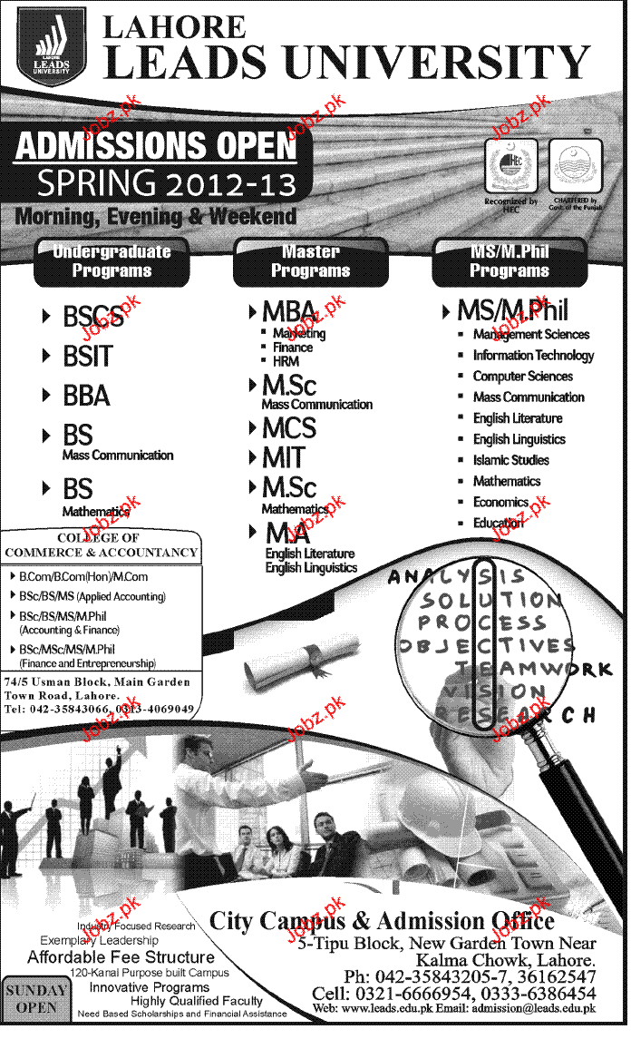 Admission in BSCS, BBA, BSm MBA, MCs, MIT and MA in Lahore Leads University in Lahre Read newspaper ad for exact details.