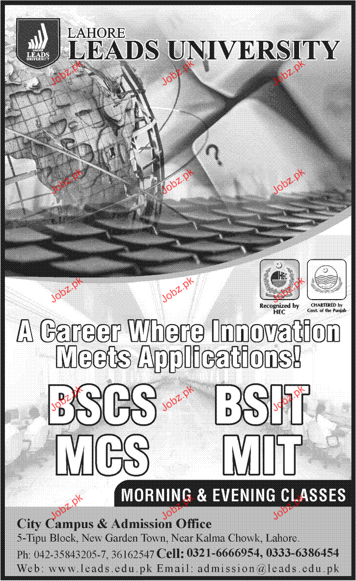 Admission in BSCS, BSIT, MCS and MIT in Lahore Leads University in Lahore Read newspaper ad for exact details.