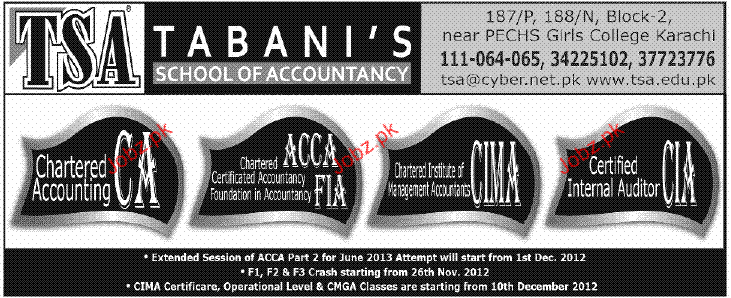 Admission in CA, ACCA, CIMA and CIA in Tabanis School of Accountancy in karachi Read newspaper ad for exact details.