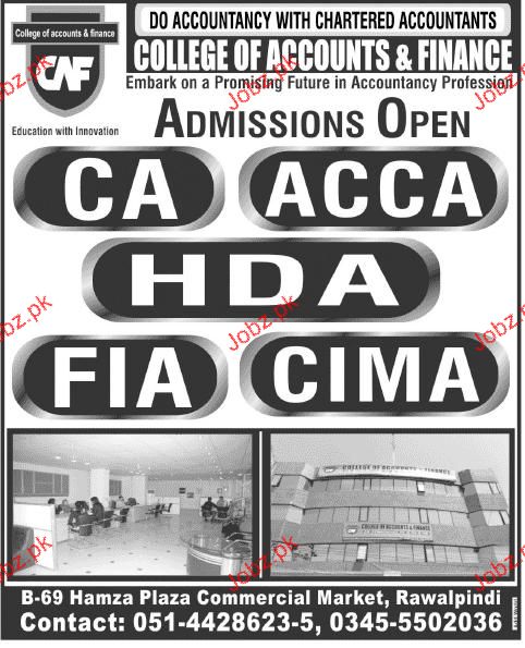 Admission in CA, ACCA, HDA, FIA and CIMA in College of Accounts & Finance in Rawalpindi Read newspaper ad for exact details.
