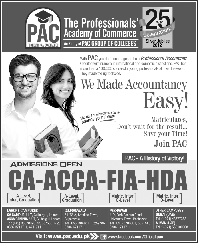 Admission in CA, ACCA , FIA and HDA in The Professional Academy of Commerce in Lahore Read newspaper ad for exact details.