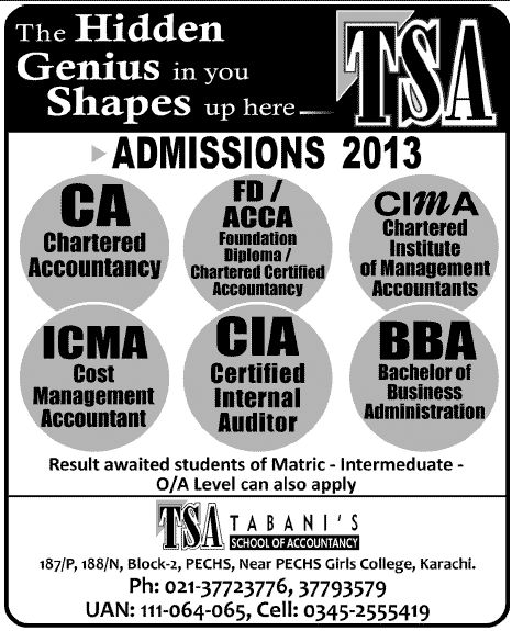 Admission in CA, CIMA, IMCA, CIA and BBA in Tabani's School of Accountancy in Karachi Read newspaper ad for exact details.