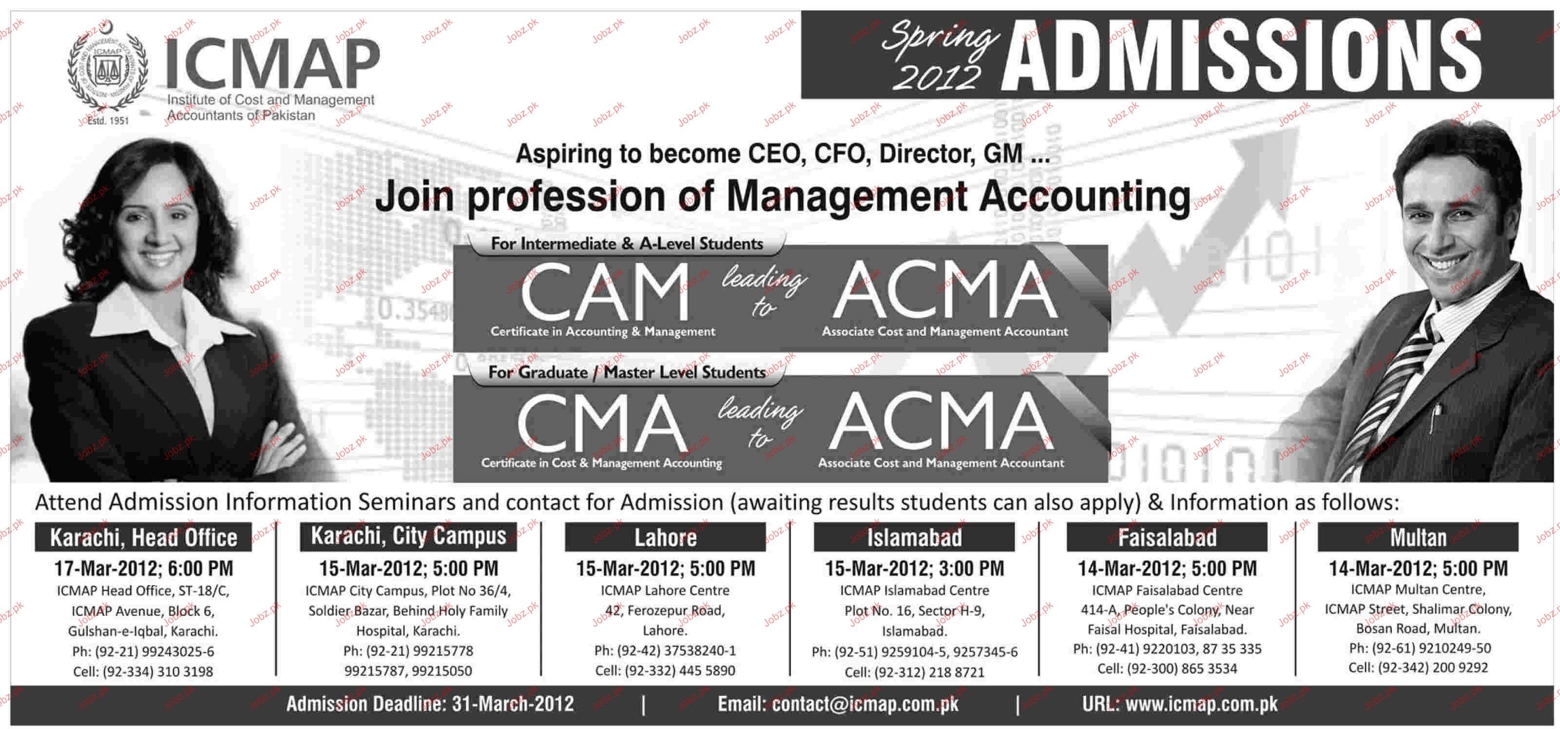 Admission in CAM and ACMA in Institute of Cost & Management Accountants of Pakistan in Islamabad Read newspaper ad for exact details.