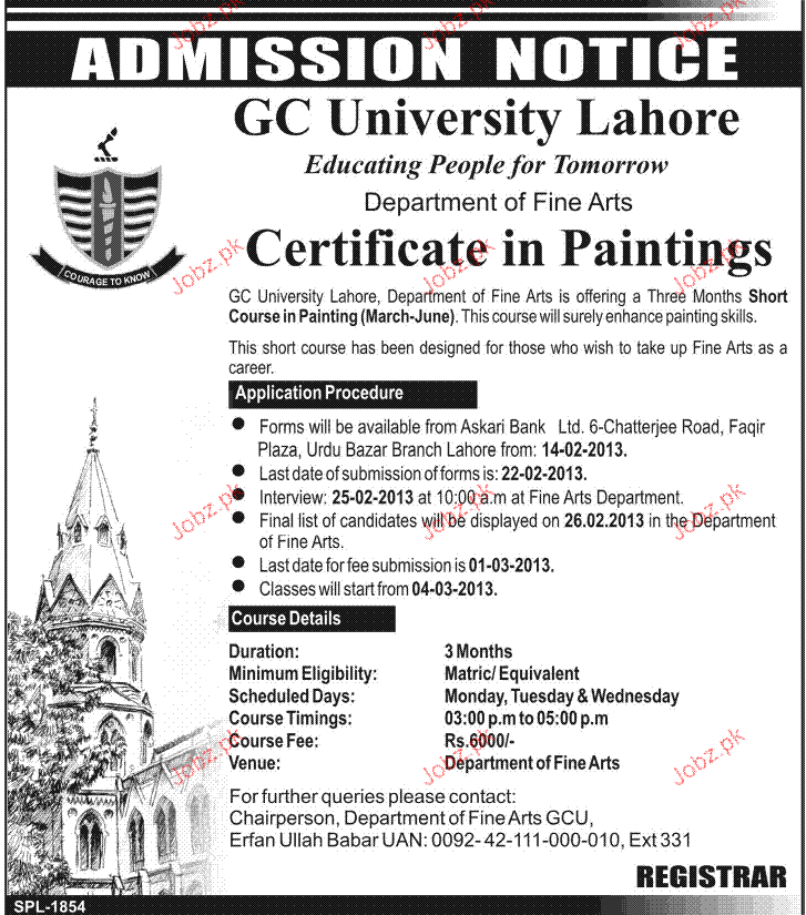Admission in Certificate in Painting in GC University in Lahore Read newspaper ad for exact details.