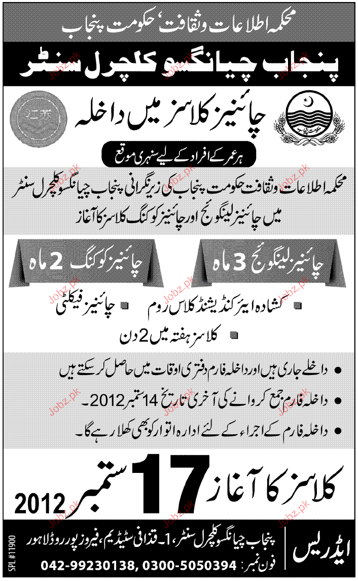 Admission in Chinese Language Course and Chinese Cooking in Punjab Chiangsoo Cultural Center in Lahore Read newspaper ad for exact details.