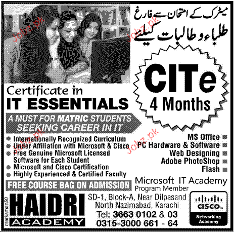 Admission in CITE in Haidri Academy in Karachi Read newspaper ad for exact details.