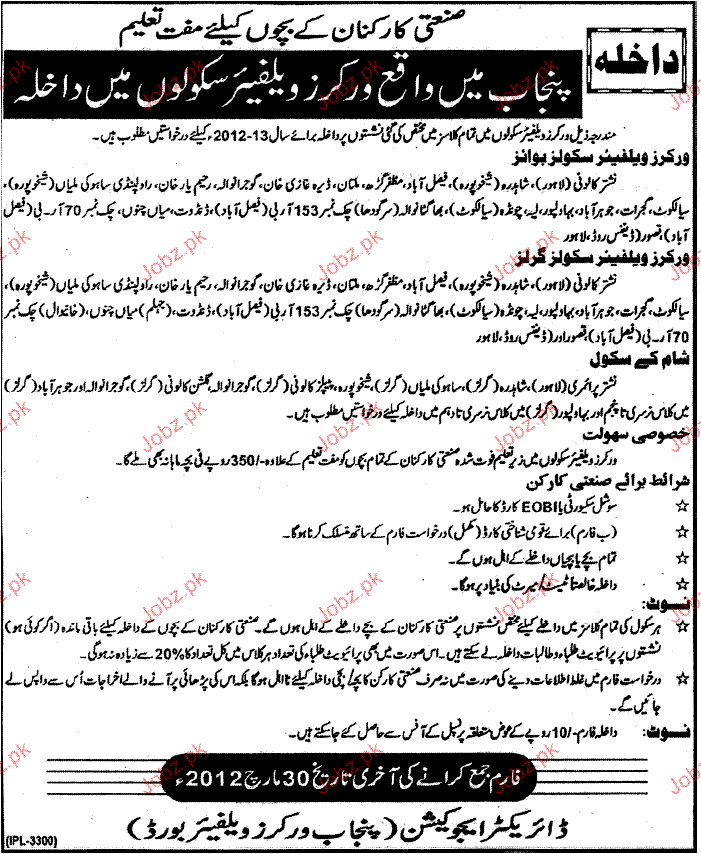 Admission in Class I to X in Workers Welfare Schools in Different Cities of Punjab Read newspaper ad for exact details.