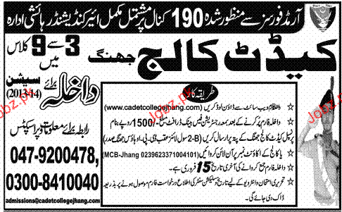Admission in Class III to IX in Cadet College Jhang in Jhang Read newspaper ad for exact details.