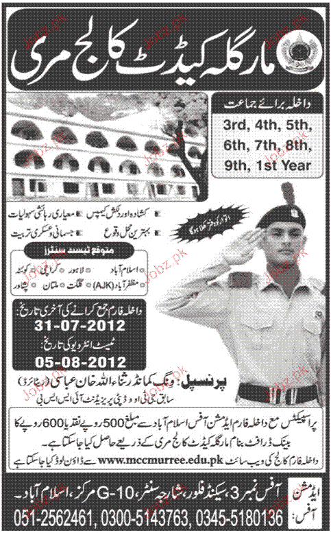 Admission in Class III to XI in Margalla cadet College Murre in Murree Read newspaper ad for exact details.