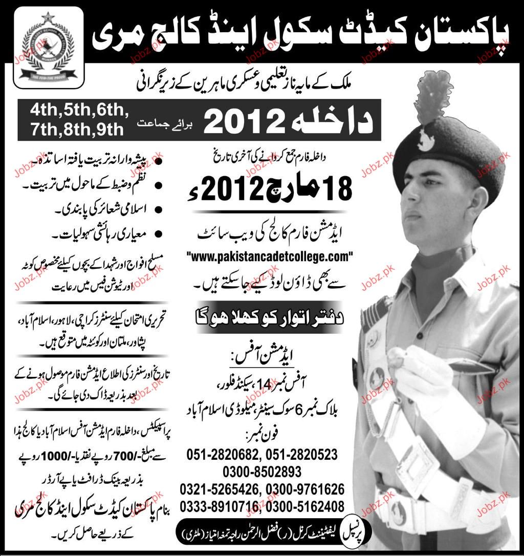 Admission in Class IV to IX in Pakistan Cadet School and College Murree Read newspaper ad for exact details.