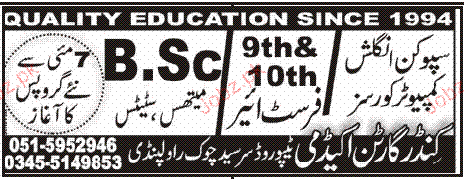 Admission in Class IX, X and B.Sc in Kander Garton Academy in Rawalpindi Read newspaper ad for exact details.