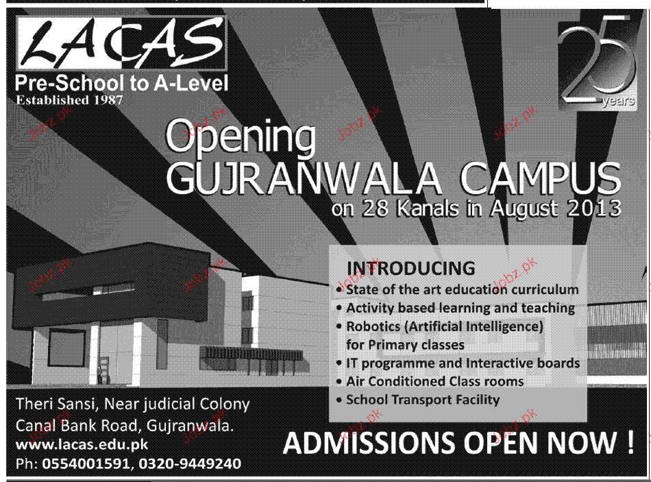 Admission in Class Pre School to O Level in LACAS in Gujranwala Read newspaper ad for exact details.
