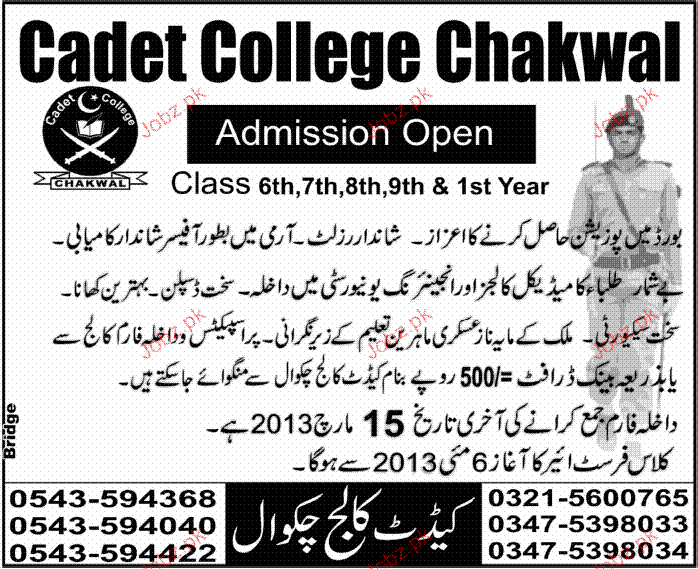 Admission in Class VI to IX & XI in Cadet College Chakwal in Chakwal Read newspaper ad for exact details.