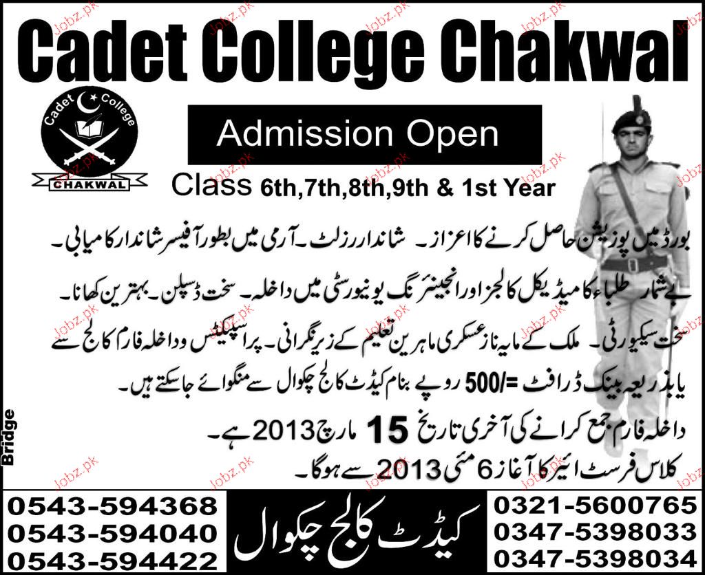 Admission in Class Vi to XI in Cadet College Chakwal in Chakwal Read newspaper ad for exact details.