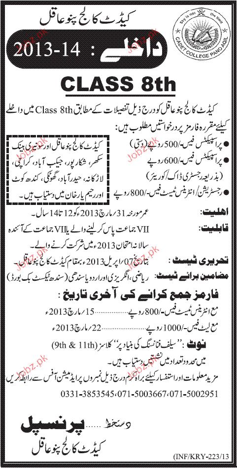 Admission in Class VIII in Cadet College Puno Aqil in Pano Aqil Read newspaper ad for exact details.