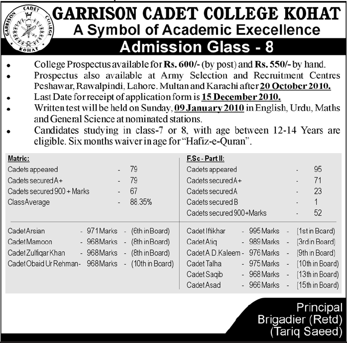 Admission in Class VIII in GARRISON Cadet College Rawalpinid Read newspaper ad for exact details.