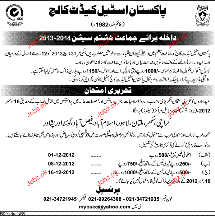 Admission in Class VIII in Pakistan Steel Cadet College in Karachi Read newspaper ad for exact details.