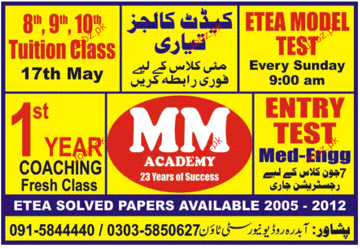 Admission in Class, VIII, IX, X and XI Coaching Academy in Peshawar Read newspaper ad for exact details.