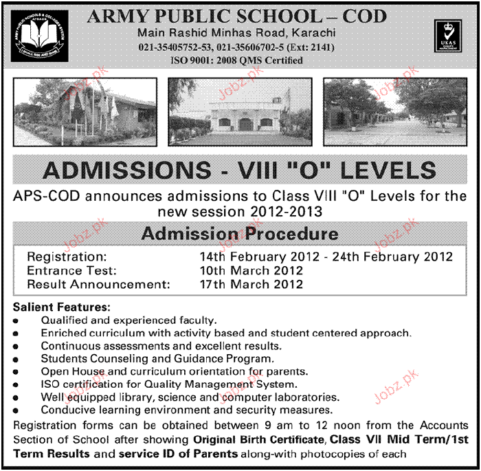Admission in Class VIII & O Levels Army Public School in Karachi Read newspaper ad for exact details.