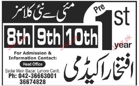 Admission in Class VIII to X in Ifitkhar Academy in Lahore Read newspaper ad for exact details.