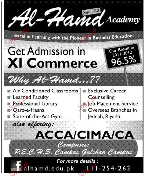 Admission in Class XI in Al Hamd Academy in Karachi Read newspaper ad for exact details.