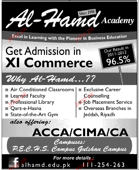 Admission in Class XI in Al Hamd Academy in Karachi Read newspaper ad for exact details.
