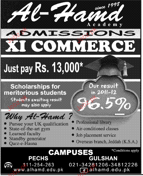 Admission in Class XI in Al Hamd Academy in Karachi Read newspaper ad for exact details.
