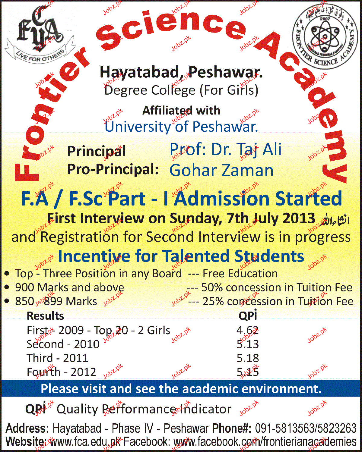Admission in Class XI in Frontier Science Academy in Peshawar Read newspaper ad for exact details.