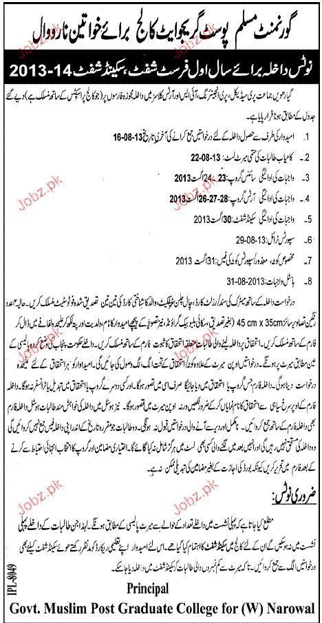 Admission in Class XI in Government Postgraduate College in Narowall Read newspaper ad for exact details.