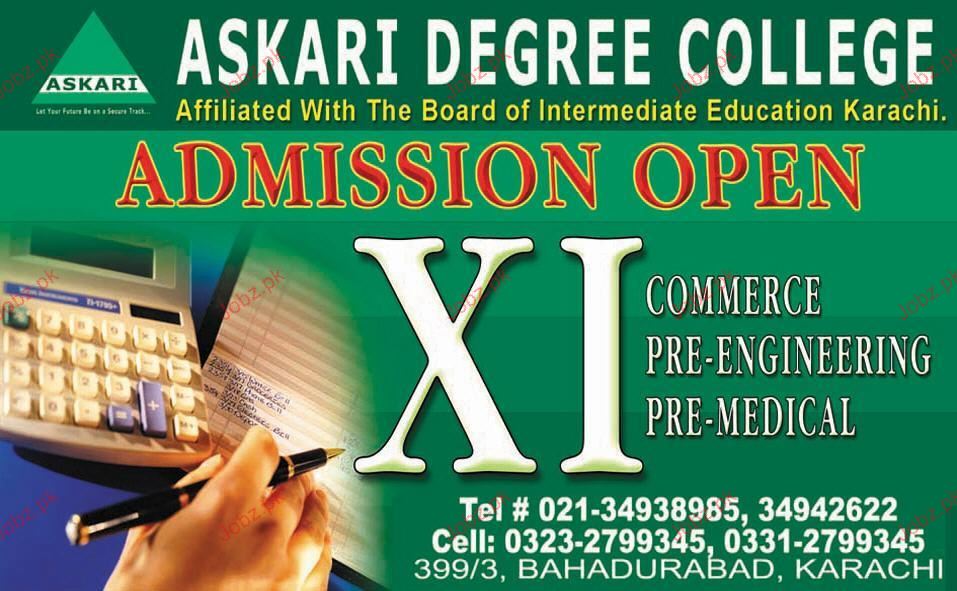 Admission in F.Sc Pre Engineering, Pre Medical and Commerce in Askari Degree College in Karachi Read newspaper ad for exact details.