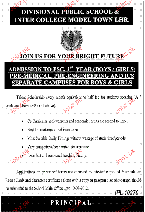 Admission in Class XI Pre Medical, Pre Engineering and ICS in Divisional Public School and Inter College Model Town in Lahore Read newspaper ad for exact details.