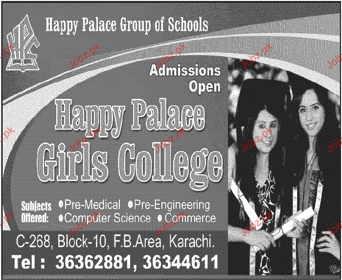 Admission in Class XI in Pre Medical, Pre Engineering and Computer Scienc and Commerce Medical in Happy Palace Girls College in Karachi Read newspaper ad for exact details.