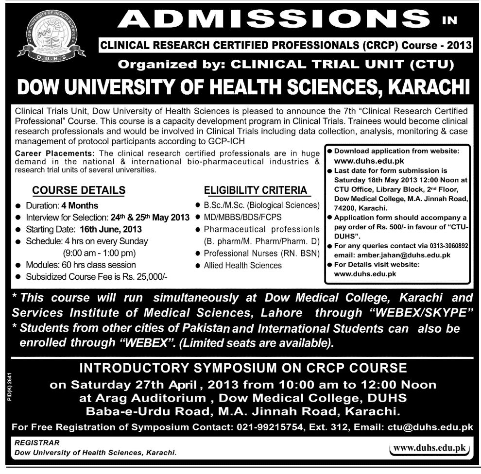 Admission in Clinical Research Certified Course in DOw University of Health Sciences in Karachi Read newspaper ad for exact details.