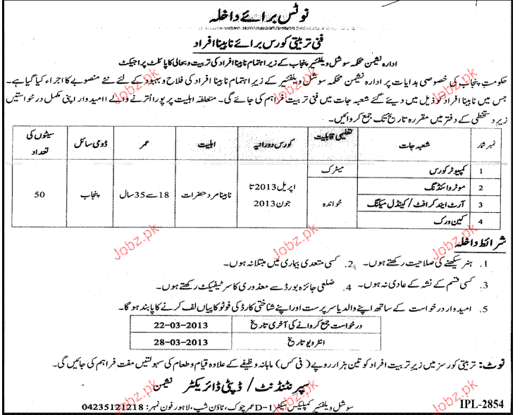 Admission in Computer Courses in Social Welfare Punjab in Lahore Read newspaper ad for exact details.