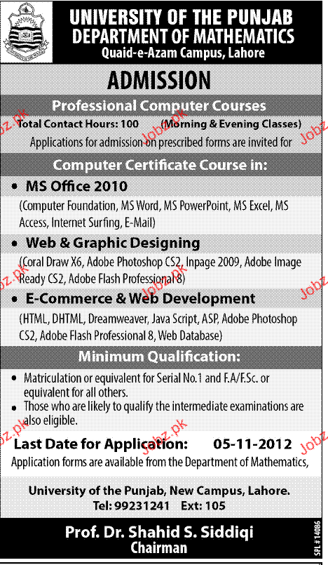 Admission in Computer Courses MS Office, Web & Graphic Designing, E-Commerce & Web Development in University of Punjab in Lahore Read newspaper ad for exact details.