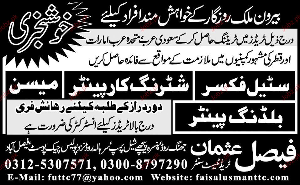 Admission in Training in Steel Fixer, Shuttering Carpenter, Mason and Building Painterin Faisal Usman Trade Test Center in Faisalabad Read newspaper ad for exact details.