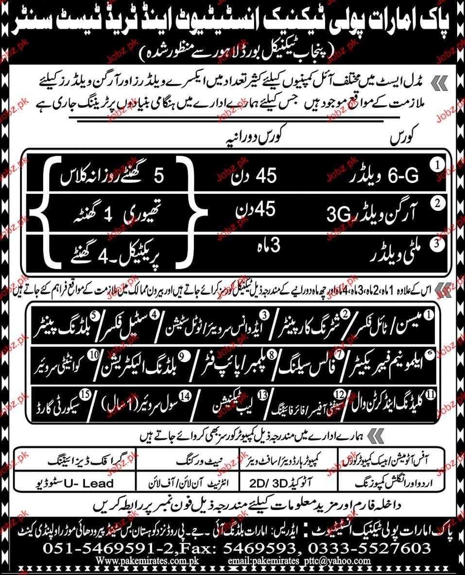 Admission in Construction Technology in Pak Emarits Ploytechic and Trade Test Center in Rawalpindi Read newspaper ad for exact details.