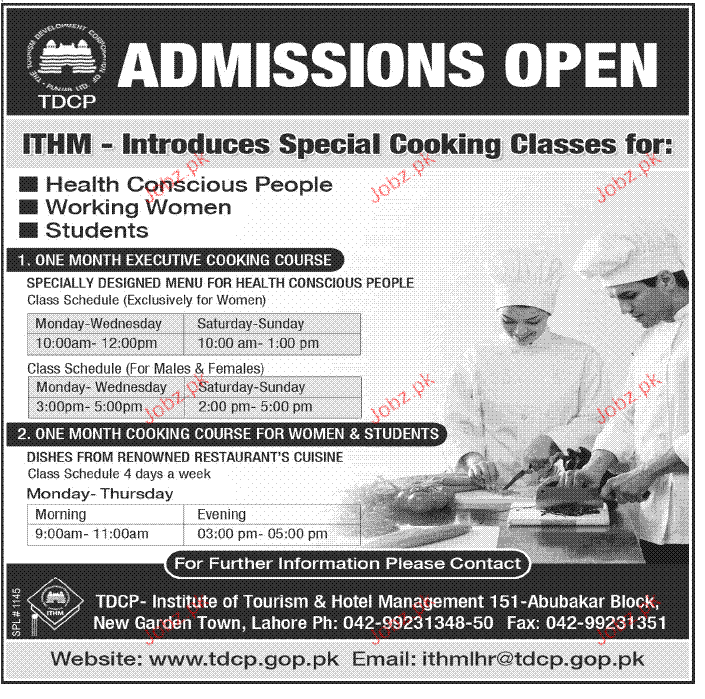 Admission in Cooking Classes in Institute of Tourism & Hotel Management in Lahore Read newspaper ad for exact details.