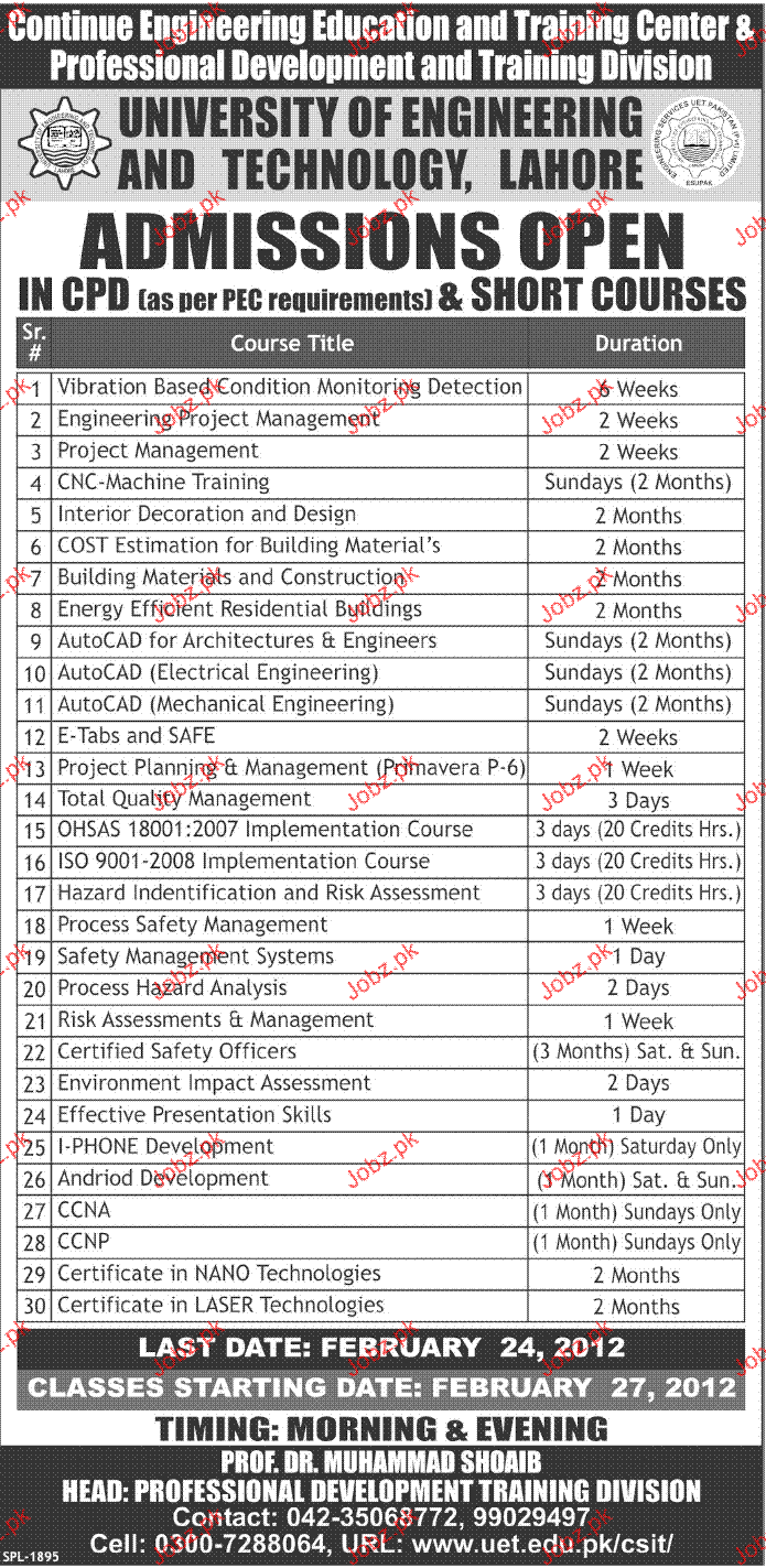 Admission in CPD & Short Courses in University of Engineering and Technology in Lahore Read newspaper ad for exact details.
