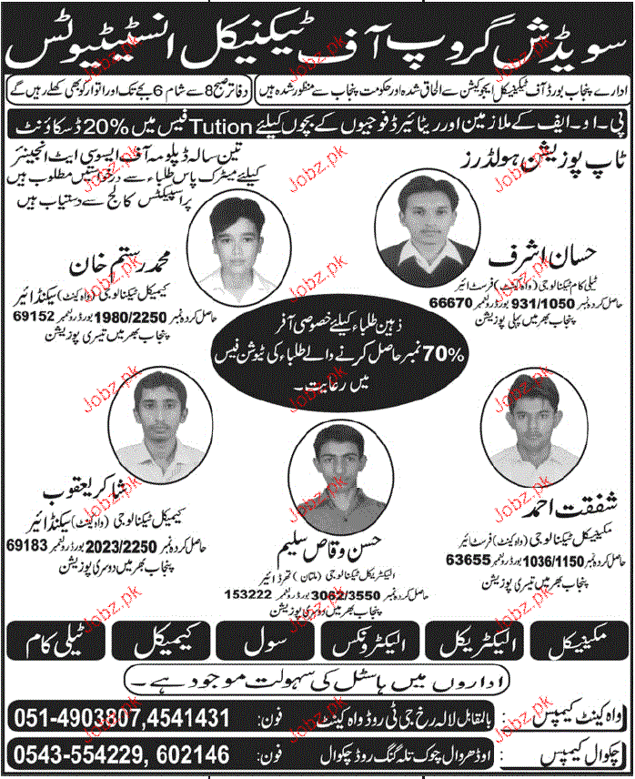 Admission in DAE 3 Years in Sweedish Group of Technical Institute in Rawalpindi Read newspaper ad for exact details.