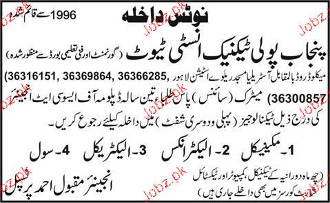 Admission in DAE Electronics, Mechanical in Punjab Polytechnic Institute in Lahore Read newspaper ad for exact details.