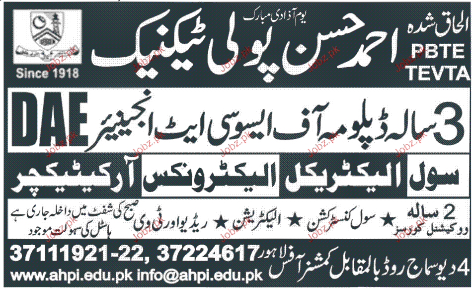 Admission in DAE in Electrical, Electronics, Civil and Architecture in Ahmed Hassan Polytechnic Institute in Lahore Read newspaper ad for exact details.
