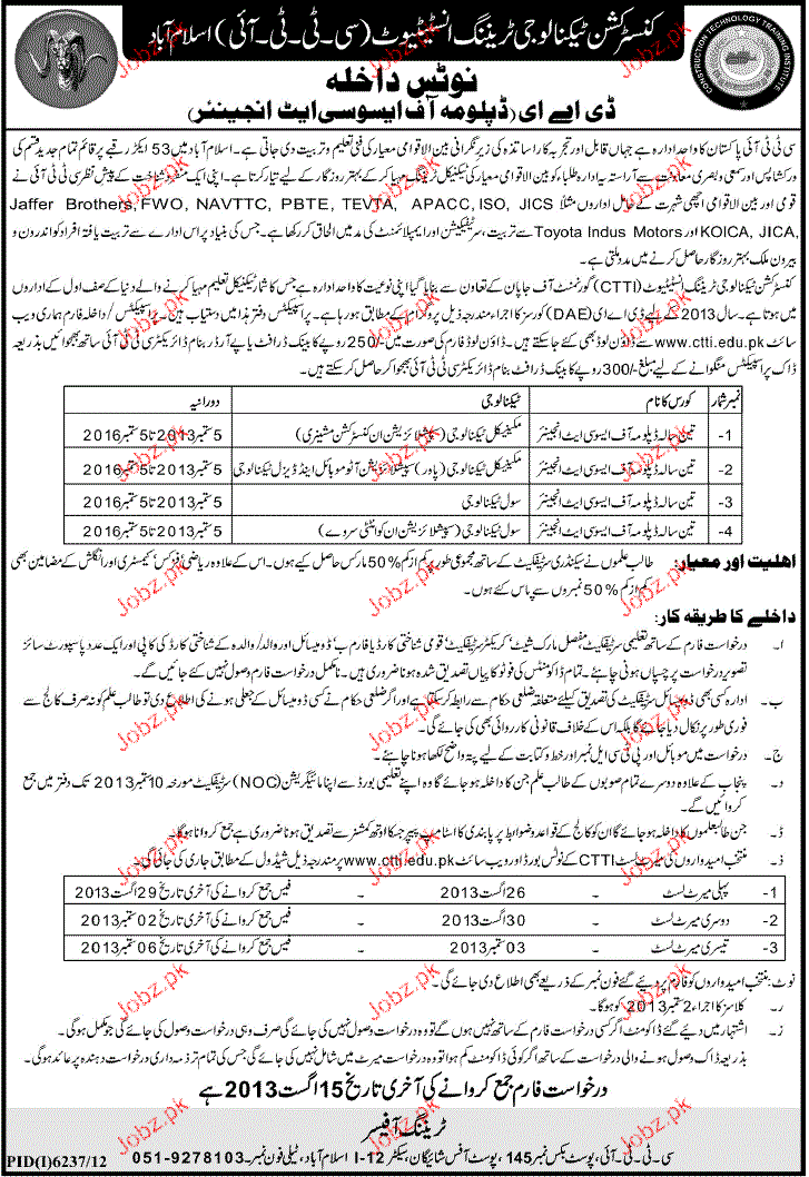 Admission in DAE in Construction Technology Training Institute in Islamabad Read newspaper ad for exact details.
