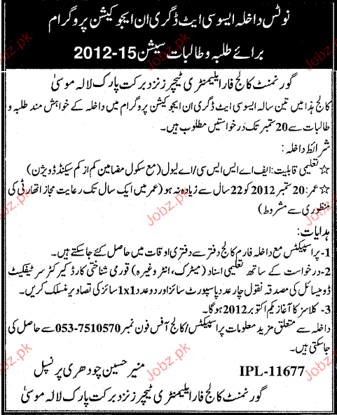 Admission in DAE in Education in in Government College For Elementary Teachers in Lala Musa Read newspaper ad for exact details.