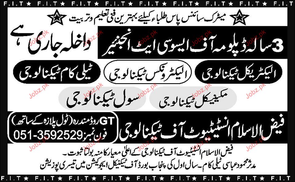 Admission in DAE in Electrical, Electronics, Mechanical, Telecom and Civil in Faiz Ul Islam Institute of Technology in Rawalpindi Read newspaper ad for exact details.
