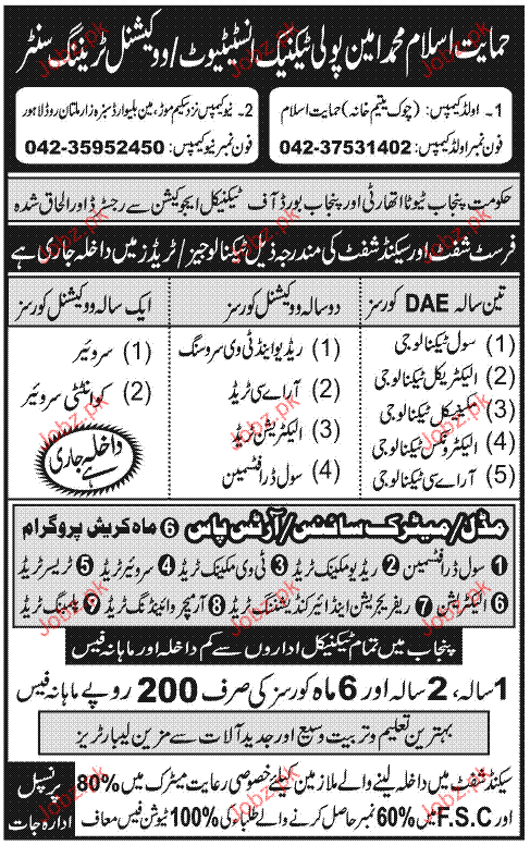Admission in DAE in Electrical, Electronics, Mechanical, Telecom and Civil in Hamyat Ul Islam Amin Polytechnic Institute / Vocational Training Center in Lahore Read newspaper ad for exact details.