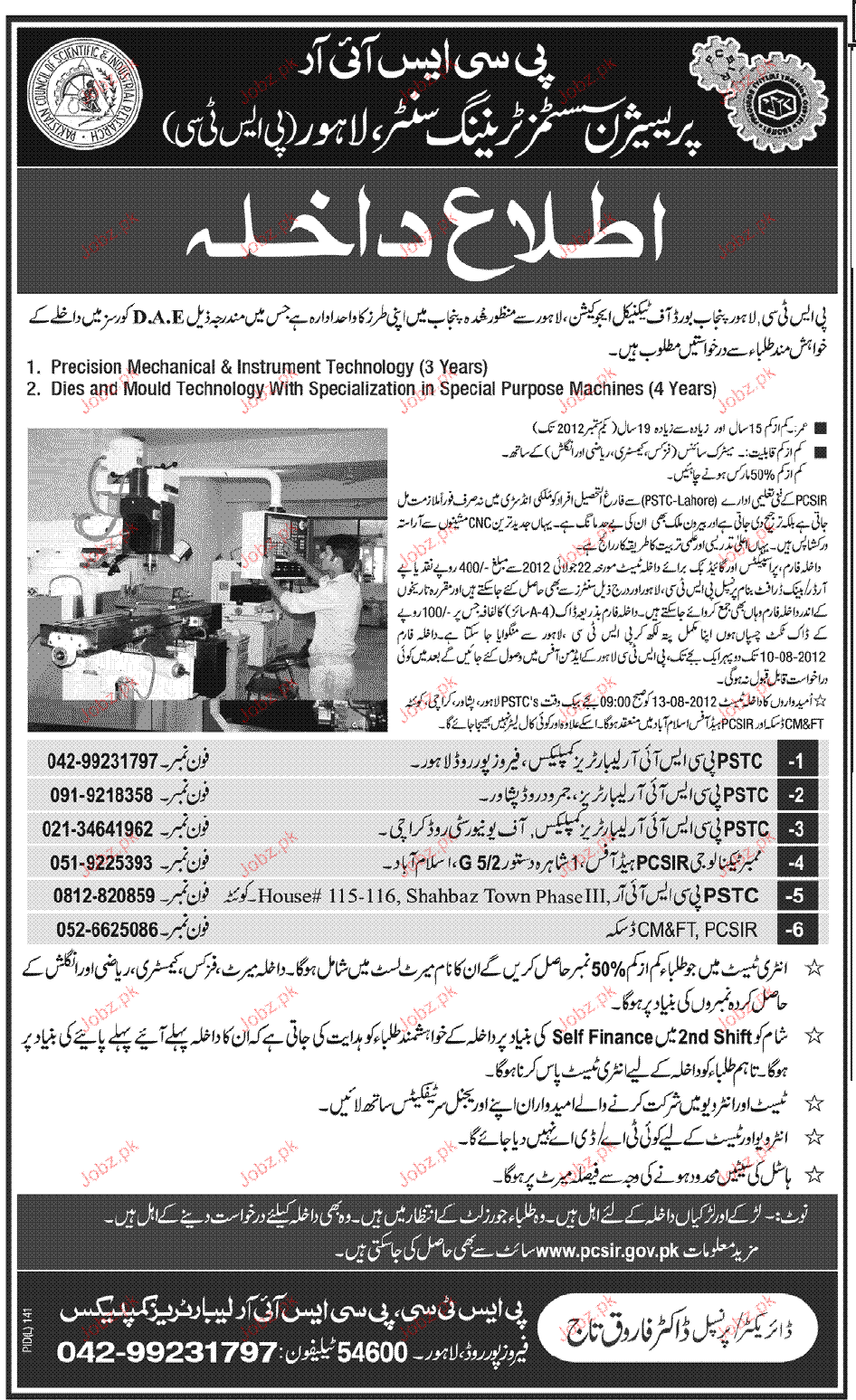 Admission in DAE Mechanical & Instrument Technology, Dies Mould Technoloy with Specialization in Specal Purpose Mechanices in Pression Systems Training Center Lahore in Lahore Read newspaper ad for exact details.