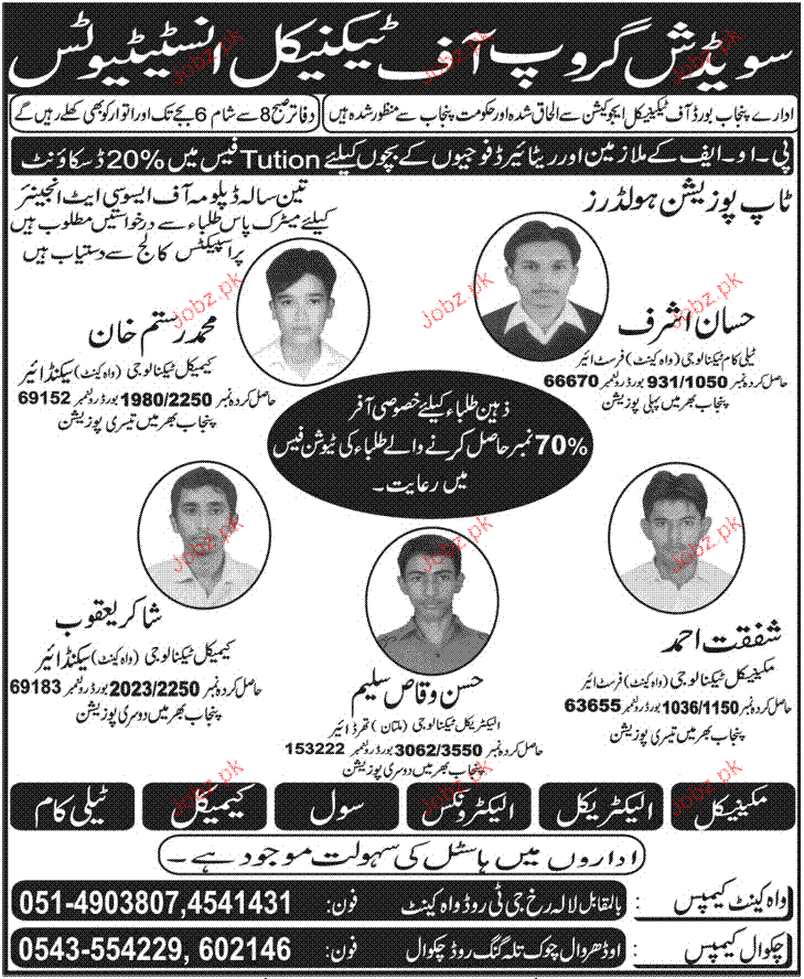 Admission in DAE in Sweedish Group of Technical Institute in Rawalpindi Read newspaper ad for exact details.