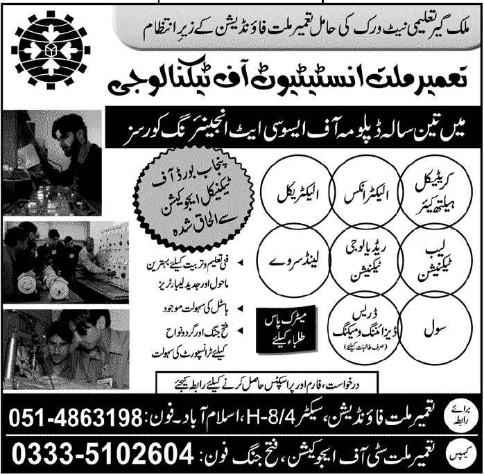 Admission in DAE in Tameer Millat Institute of Technology in Fateh Jhang Read newspaper ad for exact details.