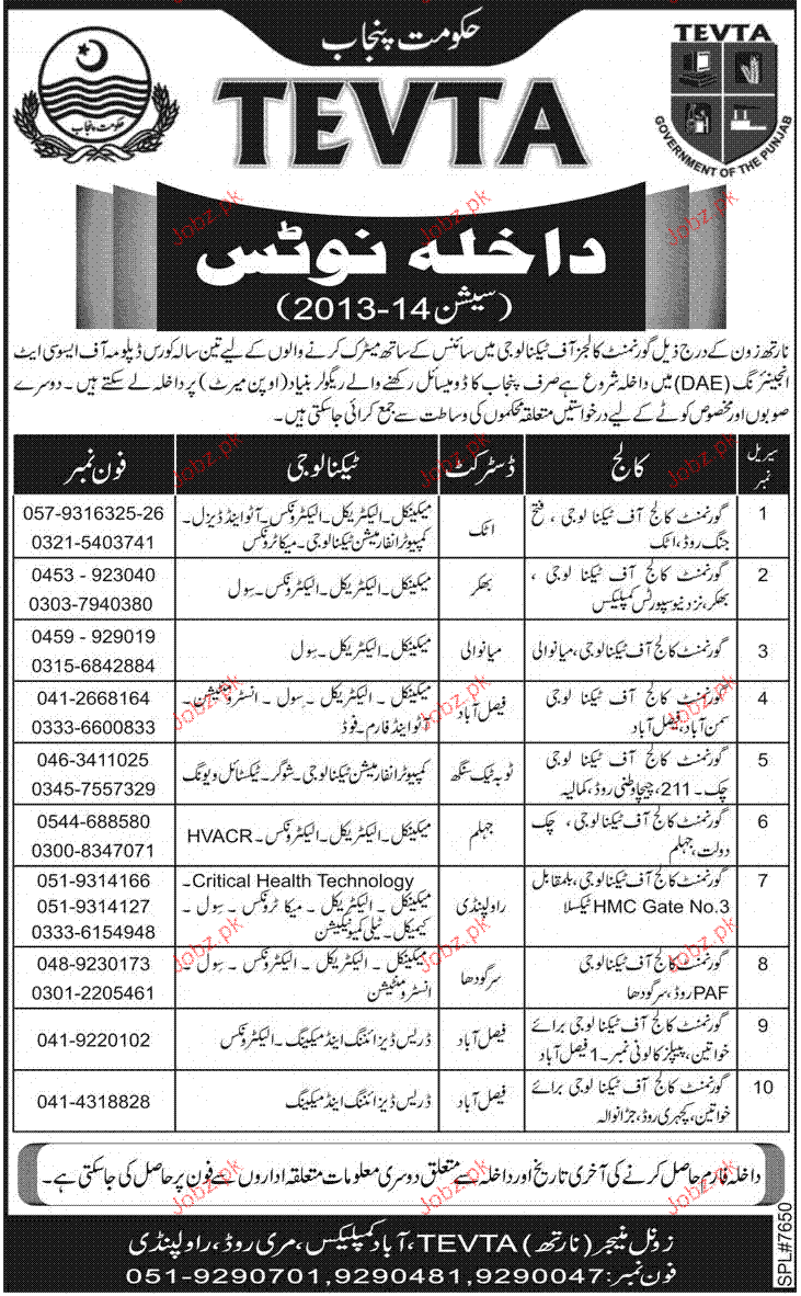 Admission in DAE in Technical Education and Vocational Authority in Rawalpindi Read newspaper ad for exact details.